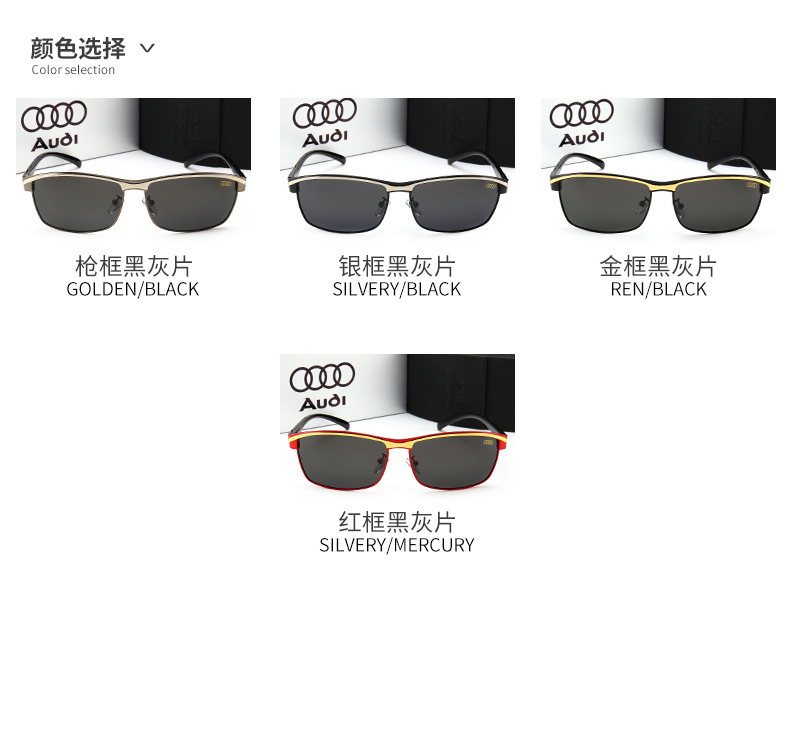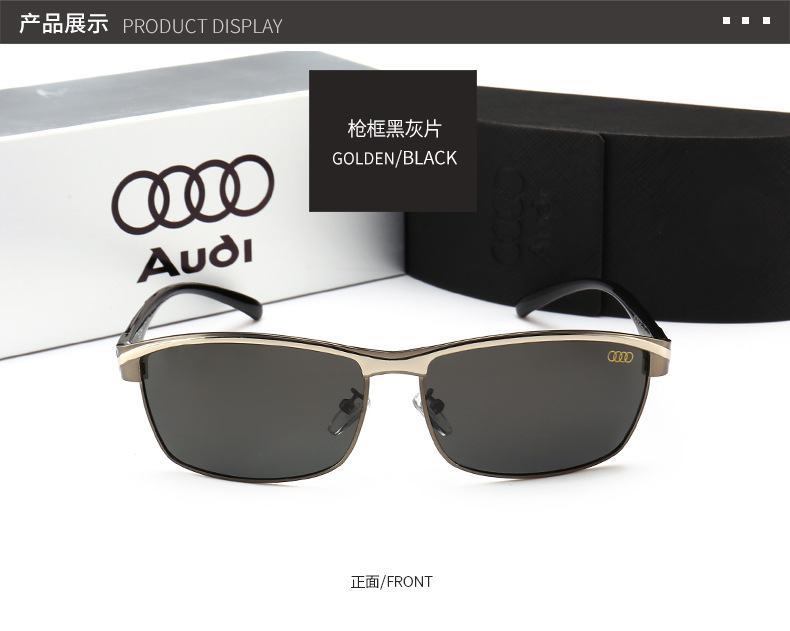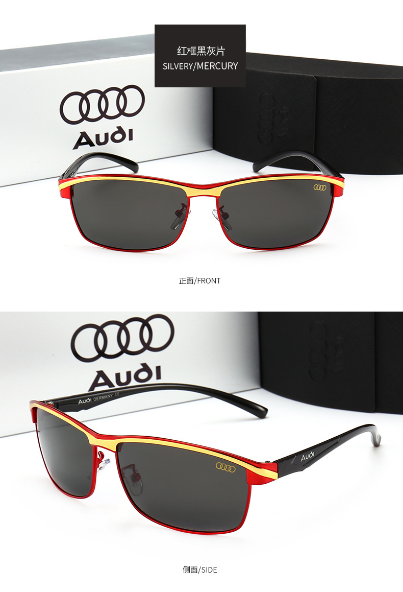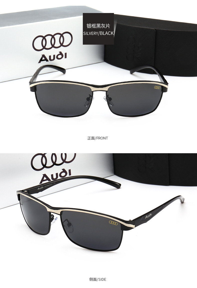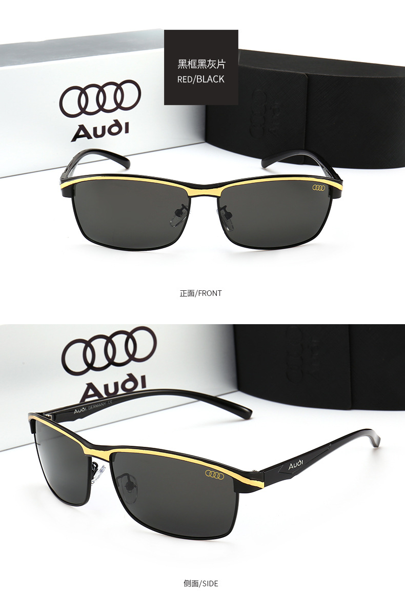These wholesale Audi car brand sunglasses offer a sleek, rectangular metal design for men. Directly from the eyewear factory, these automotive driving glasses feature polarized lenses for enhanced clarity and reduced glare. Adorned with the Audi logo, these stylish shades are perfect for driving and everyday wear. The quality metal construction ensures durability, making them a premium choice for automotive enthusiasts seeking fashionable and functional eyewear.