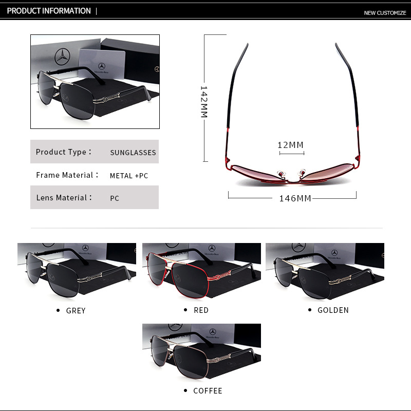 These Mercedes Benz driving glasses, model MB746, offer sophisticated style and superior performance for men. Featuring oversized square shades, they are designed with polarized lenses and an anti-reflective coating for optimal clarity and reduced glare, perfect for road trips. As luxury car brand eyewear, these wholesale sunglasses blend high-end aesthetics with practical functionality. Each pair embodies the prestigious Mercedes-Benz legacy, providing discerning customers with a premium and comfortable driving experience.